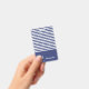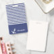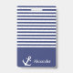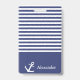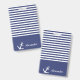 Navy blue and white striped badge can be personalised with your name. A white anchor is beside your name. Above the name are navy blue and white horizontal stripes.