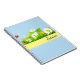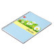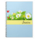 Notebook shown with a light blue background colour with a cute flowers in the grass with ladybugs graphic print and a name sample.