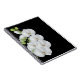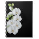 Notebook shown with a black background colour with a pretty white orchids graphic print.