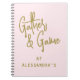 Personalised stationary notebook with the name of the host for example. Feminine, elegant, stylish, pretty, girly aspect. Simple minimalist minimal design with the customisable funny phrase quote saying “ Gather & Game” and the custom name.  A little notebook to keep track of games and sports points score at a fun family or friends gathering, at a card play game, a darts game tournament , corn hole sport game party pr a pickleball sport game . Premium look, neutral pastel candy pink background, trendy gold script handwritten calligraphy and modern clean sans serif font typography. Playdates are fun and relaxing, a true form of self care in the stressful life we have. For your hosting playdates or as a thoughtful gift for a great host. A creative useful custom gift under 15 dollars for her.
