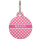 Custom name pet tag is shown in a pink plaid print, customise and change the pet's name to what you need.