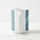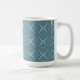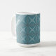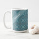 Geometric Lines Retro pattern in teal muted green colours mug. Straight connecting Lines forming a Geometric retro pattern; Sharp jet relaxed. Add your name or text in a white retro font in the tilted band over the patten in the upper corner. This placement and shape to put your text makes it more interesting and blending into the design. This pattern goes on many surfaces. Mix and match.