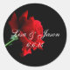 Round sticker shown with a black background and a beautiful red rose. Text: Custom name and date. Customise this item and change the names and date to yours.