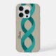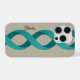 A modern phone case design featuring two intertwining turquoise spiral bands set against a smooth, muted background. Includes space to add a custom name, making it a stylish and personal gift for anyone who loves clean, elegant and artistic case designs.