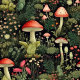 Whimsical mushroom illustrations with moss, ferns, and wildflowers