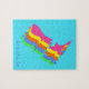 New Zealand puzzle in vibrant, bright, fluorescent colours blue, yellow, pink, green, and yellow. This Kiwi puzzle has space at the bottom to add your own text. This would make a wonderful gift!
