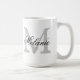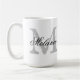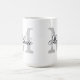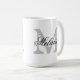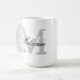 Personalised name typography monogram coffee mug. Vintage monogrammed coffeemug with stylish script letters. Cute birthday or wedding favour gift idea for me and women. Stylish cup with elegant black and white colours. Available as big extra large oversized jumbo mug and to go travelmug. Double sided design.