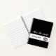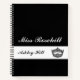 Custom notebook is shown in a black colour with an accent strip with a Miss America style crown print and a queen's title and name sample.