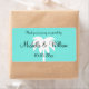 Custom aqua / turquoise blue palm tree beach wedding water bottle labels. Personalised elegant waterbottle sticker template with plamtree silhouette. Stylish script typography for names of bride and groom and thank you message. Use as classy table decoration or thank you favour for guests at the wedding / bridal party. Logo includes name or monogram plus date of marriage. Classy design with customisable background colour. Perfect for destination weddings. Also great as wine label.