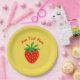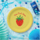 Custom paper party plate with red strawberry design. Cute party accessories with fruity print. Yellow green and red colours. Add your own personalised text. Great for kids Birthday, wedding, dinner party etc. Available in different sizes fro serving homemade cake, sweets, pastry food, desserts and more.