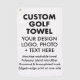 Custom personalised 16" x 24" Golf Towel. Design, create, make your own personalised polyester blend microfiber, machine washable Golf Towel with Grommet and brass-plated hook from a blank template. Customise the front of the towel, edge-to-edge print, with your logo, photo or design, and add text. A great customisable, personalised gift for golfing fans, for Christmas, a birthday or other special occasion. Add your logo and branding for a members' golf or country club, sports facility, school, hotel, health club, or for a corporate gift.