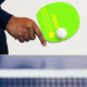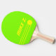 Acid green background colour, with three vivid yellow stripes, a circle (ball) and custom name (sportive font style)... very brightly coloured table tennis paddles