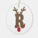 A custom personalised ornament featuring monogram letter "R" and our favourite reindeer...antlers, red nose, and all! Christmas tree ready!