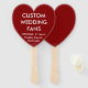 Custom printed personalised 6" RED HEART WEDDING FANS (sets of 10) Blank Template. Design, create, make your own. Your wedding photo, image, message, text, bride and groom names, logo, graphics, in full colour print individually designed on both sides of the fan. 5.75" diameter. Available in white and ecru cardstock (customise to any colour). Simple assembly required - wood handles and 4 glue dots per fan included (available pre-assembled for an upcharge). Available Round, Heart shaped, Paddle or Rectangle.