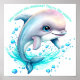 This is the beautiful hand painted elegant watercolor flying dolphin drawing in purple and cyan colour above the water.