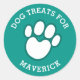 Stylish dog treats stickers for your special fur baby. Especially useful if one of your pets has special dietary requirements. Design shows white and dark teal pawprint against a pretty teal background, with white curved text that reads 'Dog Treats For (placeholder name)'. ALL TEXT IS CUSTOMIZABLE. Available in other colours.