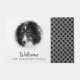 Custom pet photo template in black and white colours. Replace the sample image with a photograph of your own pet and personalise the text areas with your custom text. A part of the design features a pattern of black dog paw prints on a grey background colour. The custom photo is shown through a round shape that gives an uneven soft edge to any image.