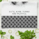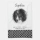 Custom pet photo template in black and white colours. Replace the sample pet photo with a photograph of your own pet and personalise the text areas with your pet's name and your custom text. The bottom part of the design features a pattern of black dog paw prints on a grey background colour while the photo template and custom text take most of the design area. The custom photo is shown through a round shape that gives an uneven soft edge to any image.