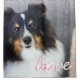Personalizable pet photo template design together with a script text that reads: "love". The letter "O" is replaced with a heart shape. On the heart there are some dog paw prints and a personalizable text area for the name of the pet. The text is written in pink and white colour scheme.