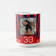 Add some retro-cool to your 30th birthday gifting with this dynamic design. Vibrant blue and red stripe background and College style lettering. Personalise it with a photo of the guest-of-honour. Can be customised for any age!