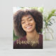 The front of this 30th birthday invitation features the guest of honour's photo with the words "thank you" in elegant gold-coloured calligraphy script overlay. A dark screen helps make the text pop. Customise the reverse side with your personal message in gold-coloured sans serif font and your name in script on a black background.