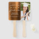 Help your graduation guests keep cool during the ceremony or party with these custom photo graduation hand fans, featuring the words "Congratulations to our Graduate" in white text on a copper faux brushed metal background. The word "Graduate" appears in a graceful handwriting-style script. A pair of gold faux glitter mortar board caps and a scattering of gold confetti decorate the top portion of the label. Personalise one side with your grad's name, school, and year of graduation. Easily replace the sample image on the other side with a photo of your grad.