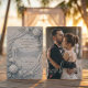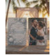 Convey refined gratitude after your formal garden celebration with this romantic aesthetic, featuring off-white tones, botanical details, and a portrait.The layout establishes a strong visual hierarchy centered around a full-bleed, focal-point couple's portrait rendered in muted charcoal tones. This central image is enclosed by a simulated architectural border designed to mimic classic sculptural elements, including draped leafy vines, dense floral clusters, and a domed pavilion structure utilizing soft silver blue-grey and off-white shading for depth. A sharp, hand-drawn red heart provides a distinct, vibrant pop of contrasting color, while the text layout balances elegant formal calligraphy with traditional cursive handwriting for an upscale, legible composition.This is a flat printed image with a faux sculpted plaster effect, not actual raised material.