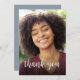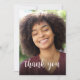 The front of this 30th birthday invitation features the guest of honour's photo with the words "thank you" in elegant white calligraphy script overlay. A dark screen helps make the text pop. Customise the reverse side with your personal message in white sans serif font and your name in script on a dusty blue background.