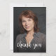 The front of this 50th birthday invitation features the guest of honour's photo with the words "thank you" in elegant white calligraphy script overlay. A dark screen helps make the text pop. Customise the reverse side with your personal message in white sans serif font and your name in script on a dusty blue background.