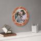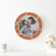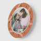 This modern wall clock is decorated with a geometric pattern in terracotta and white.
