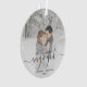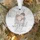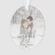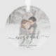Commemorate your engagement with this beautiful modern keepsake ornament. The dark pine green text reads "Our first Christmas engaged," with the word "engaged" in elegant handwriting script with flourishes before and after. Replace the sample image with your favourite photo, and add your names and the year. A white gradient filter helps make the text pop.