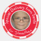 These festive, Christmas themed gift tag stickers feature an outer red frame, followed by a red and white peppermint candy cane pattern frame. The message "Special Delivery from Santa" is printed at the top in a whimsical red font. A sample name is printed at the bottom in a matching red font. A photograph is placed in the centre which you can replace with your own child's photo or custom image.