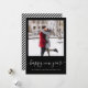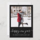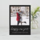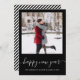 A simple yet elegant card to help you connect with friends across the miles. The words "happy new year" appear in white handwriting script on a black background, with decorative swashes reaching to the edges of the card. Easily customise it with your favourite square photo, along with your names and the year below in white sans serif font. A pattern of black and white diagonal stripes appears on the reverse side.