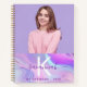 A pink, purple and blue holographic background.  Personalise and add your own photo, a name, monogram letter and a text/year. The name is written in purple with a large modern hand lettered style script with swashes. The monogram letter in white For school, work as a sketchbook, diary and journalling. To keep the swashes only delete the sample name, leave the spaces or emoji's in front and after the name