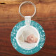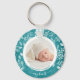 Round button keychain features your favourite photo surrounded with white leaves, berries and dots on a textured turquoise background. TIP: Upload a high resolution photo that features your baby in the middle - you can crop to a square, too. Keychains make memorable gifts for family, grandparents and friends or create for yourself.