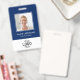 On the front, you'll find dedicated spaces for your photo, first name, last name, title, and logo, while the back offers room for your logo and additional text. This dual-sided design enhances visibility and professionalism. You can choose from different attachment styles: lanyard, metal clip, retractable or none.
