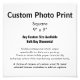 Custom Photo Print blank customisable, personalised custom print photo print template - 9" x 9" square Kodak Professional Photo Paper (Satin) photo print, developed specifically for darkroom printing, Kodak photographic paper is a premium silver-halide photo paper that is designed to dramatically enhance your picture colours, while still maintaining a consistent tonal reproduction, all photo prints available in dozens of custom metal or colour toned wood frame options, (made in the USA with 100% Ash wood) and hand-fitted by a team of professional framers, with mat (mount, card frame) and frame glazing options available - for photo, image, text, or your own customised design creation. CUSTOM PHOTO PRINT (BULK BUY DISCOUNT PRODUCT) MULTI PURCHASE SAVINGS: 4 photos. (Save 10%) 51 photos. (Save 15%) 101 photos. (Save 20%) Note: Check the drop down options on Item Quantity 'Qty' button for current discounts on specific numbers ordered. Multi purchase savings refer to .com rates - discounts on multiple orders from other country specific Zazzle sites may differ or may not be available. All stated discounts are correct at time of input and are subject to change. ADD A STANDARD FRAME: Black Wood STANDARD FRAMES are made of 100% wood and are a very affordable finishing touch! Standard frames come ready-made in many standard sizes, and so are available only on standard size photo prints but not custom sizes, which will require your choice of wood or metal CUSTOM FRAME. Depending on the dimensions of your photo print, there may be options of mount, mat, card frame to surround your photo print within the frame. ADD A CUSTOM FRAME: Custom frames are hand-made by pro framers and are therefore available for any standard or custom size photo print. Featured in wood and metal styles, custom frames are a perfect complement to your art. Depending on the dimensions of your photo print, there may be options of a first and second mount, mat, card frame to surround your photo print within the frame. Your also have the option of Acrylic, Acrylic (Non-Glare) or Acrylic (UV-Protection) glaze applied to your choice of frame. CUSTOM FRAME GLAZING OPTIONS: ACRYLIC: The most basic type of glazing, this clear sheet of acrylic is firm enough to avoid bending in the frame. Standard acrylic glazing works to protect your image from dust and dirt, and is more impact-resistant than glass, so you don't have to worry if the picture falls down. It is perfect for use in children's rooms and in high-traffic areas of your home or office. ACRYLIC, NON-GLARE: Lightly etched to produce a surface pattern that diffuses reflections, non-glare acrylic glazing makes your artwork easier to view. With a matte finish, this glazing option can be useful when your art is placed in a brightly-lit area. ACRYLIC, UV-PROTECTION: Designed for conservation, acrylic glazing with UV-protection keeps your image from fading, yellowing, and brittling as a result of exposure to direct sunlight and artificial light. The best option for framing your museum quality fine art and photographs, UV-protection acrylic filters out the damaging UV-rays to make your art enjoyable for many years to come. CUSTOM WOOD FRAME COLOR & SIZE OPTIONS (some options may not be in stock): Cherry Frame (1 1/4") Honey Oak Frame (1 1/4") Country Honey Frame (1 1/2") Black Coffee Frame (1 1/8") Black Coffee Frame (1 1/2") Sunset Gold Frame (1 1/8") Whitewash Frame (1 1/4") Honey with Rope Frame (1 1/4") Gold Ornate Frame (1") Walnut with Rope Frame (1 1/4") Antique Silver Ornate Frame (1") Barnwood Olive Green Frame (1 1/2") Barnwood Mocha Frame (1 1/2") Satin Black Frame (1 3/8") Country Honey Frame (2") Sunset Gold Frame (2") Black Coffee Frame (2") Traditional White Frame (1 1/4") Rainbow White Frame (7/8") Rainbow Red Frame (7/8") Rainbow Green Frame (7/8") Rainbow Royal Blue Frame (7/8") Rainbow Canary Frame (7/8") Rainbow Orange Frame (7/8") Rainbow Lavender Frame (7/8") Rainbow Navy Blue Frame (7/8") Rainbow Black Frame (7/8") Sunset Gold Frame (1 1/2") Walnut Starflower Frame (7/8") Sunset Gold Frame (1 1/2") Bronze Scoop Frame (1 1/8") Charcoal Scoop Frame (1 1/8") Country Honey Frame (1 1/8") Country Honey Frame (1 1/2") Black Coffee Frame (1 1/2") Plum Ornate Frame (1 1/2") Tan Rustic Frame (1 1/4") Brown Rustic Frame (1 1/4") Black Rustic Frame (1 1/4") Gold Ornate Frame (1 1/2") Pewter Ornate Frame (1 1/2") Gold Ornate Frame (2") Antique Silver Ornate Frame (2") Walnut Two-Tone Frame (1") Honey Two-Tone Frame (1") Basic Black Frame (1 1/4") Basic Natural Frame (1 1/4") Basic Mahogany Frame (1 1/4") Basic Fruitwood Frame (1 1/4") Basic Black Frame (3/4") Basic Natural Frame (3/4") Basic Mahogany Frame (3/4") Basic Fruitwood Frame (3/4") Basic Walnut Frame (3/4") Matte Black Frame (1 3/4") Natural Frame (1 3/4") Mahogany Frame (1 3/4") Fruitwood Frame (1 3/4") Walnut Frame (1 3/4") Heavily Distressed Black Frame (1 1/2") Distressed Black Frame (1 1/2") Distressed Walnut Frame (1 1/2") CUSTOM METAL FRAME COLOR & SIZE OPTIONS (some options may not be in stock): Matte Black Metal Frame (7/16") Bright White Metal Frame (7/16") Mosaic Blue Metal Frame (7/16") Chinese Red Metal Frame (7/16") Anodic Black Metal Frame (7/16") Graphite Metal Frame (7/16") Frosted Walnut Metal Frame (7/16") Gold Metal Frame (7/16") Frosted Gold Metal Frame (7/16") Frosted Silver Metal Frame (7/16") Silver Metal Frame (7/16") Burnt Sienna Metal Frame (7/16") Matte Black Metal Frame (1 3/8") Brushed German Silver Metal Frame (1 3/8") Florentine Grey Metal Frame (1 3/8") Florentine Walnut Metal Frame (1 3/8") Black Metal Frame (1 3/8") Brushed Antique Gold Metal Frame (1 3/8") Brushed Satin Chocolate Metal Frame (1 3/8") CUSTOM FRAME MAT, MOUNT, CARD FRAME OPTIONS (In order from most popular): White Conservation Mat Antique White Conservation Mat Sand Conservation Mat Ivory Conservation Mat Buff Conservation Mat Yellow Conservation Mat Pink Conservation Mat Light Blue Conservation Mat Black Conservatio