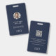 Enhance your corporate security with our Custom Photo QR Code Employee ID Badge. Featuring a customisable employee photo, name, and title on the front, along with your logo, this badge exudes professionalism and functionality. The back offers space for a custom QR code, company name, and address, or personalised text, providing comprehensive identification for your staff. With a rich navy blue background and grey classic typography, this badge offers a modern, minimalist design suitable for any business environment. Elevate your corporate branding and security measures with our customisable ID badge solution.