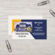 Business card featuring your own custom photo of yourself or a house on a geometric design background in off-white, ocher and dark blue.