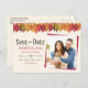 Spread the word with a "Save The Date" announcement for your autumn wedding featuring your custom photo and a border of colourful fall leaves and firefly lights on a string. Replace the placeholder photo with your special horizontal photo. Personalise the text in the template fields or click customise to select a font style, size, and colour you prefer.