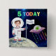 Custom birthday age button for kids, upload their photo and name to the fun space graphic with a friendly alien trailing party streamers in celebration.
