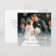 This simply chic custom photo wedding thank you card template features an elegant, minimalist, modern design. The front features your favourite photo, first names and a 'LOVE and THANKS' message conveyed with a striking blend of two distinct fonts, with 'and' in a light, flowing script between the rest of the other two words, which are in upper case with a bold, crisp formal look.The 'LOVE and THANKS' part of the design can't be altered. This design element along with the first names text below it is in standard black. When you edit the front to show your own names, you might change the format to show your first names with last name, or 'Mr. and Mrs......' or whatever suits your style. You can also edit the font, size and colour of this names text. On the back, we've set the background as transparent, so that the colour of the paper will simply serve as the base colour. You can choose a colour for the background, if you prefer. The default text colour on the back is black, but you can change this if you prefer another colour. We've put some sample text on the back for you to replace with your own message as you see fit, but please don't feel restricted by this. If you prefer delete our sample text entirely and keep the back totally blank so that you can write a handwritten note on each card instead, you can do that. Or you might want to replace our text with your own message of gratitude and your own closing and then hand sign your names when you receive the cards. In any case, please do remember to remove all of the sample/placeholder text on both sides as well as our sample photo! We've chosen matte rather than semi-gloss as the default paper choice, as it is well suited to writing your own message on and won't smudge. You can of course change this to semi-gloss or something else. We hope you'll enjoy experimenting with various aspects of this stylish modern wedding thank you card template's appearance and make it uniquely yours with the intuitive design tools, your favourite photo and your inspiration. And please check our shop for more simply chic modern wedding thank you cards!