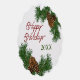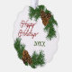 Contemporary Christmas holiday season ornament card with classic 'Happy Holidays' greeting wish on rustic green pinecone pine needles branches wreath motif on a crisp white background. With the option to customise or personalise with your family name and (limited) text of your choice.