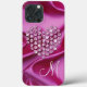 A contemporary image of a faux shiny diamonds heart on a bright hot pink coloured printed image of wavy satin fabric. With room to customise or personalise with a monogram of your choice. Beautiful, modern, and cool cover for the trend-savvy and art-loving hip trendsetter, artsy motif lover who wants to protect their phone from dust and dirt, wear and tear. This design is available in Apple iPhone 6, 7, and 8 Plus, 10 or X, XR, XS, 11, 12, 13 Mini, 14, 15, Plus, and Pro Max cellphone cases. Show off your style, look fashionable trendy, and feel stylish with a unique design on a mobile device accessory of your choice.