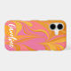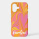 iPhone case with a bright and whimsical abstract marble pattern with swirls of vibrant shades of pinks and yellows, personalised with your name.