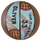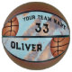 Custom Player Name, Number and Team Name Keepsake Basketball. Watercolor background texture in blue and grey colours. Personalise it with your team name, player number and name. The design has two basketballs drawings on the left and the right side. A great personalised basketball keepsake to remember the favourite sport.