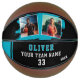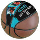 Custom Player's Name Number Team 2 Photo Basketball. Personalize it with your 2 photos, name, team name, your team number and the year. The text is trendy white and blue bold font on a black background with blue stripe. You can change any text on the basketball or erase it. A perfect gift for a basketball player, teammates, coach, your friends and family. Great keepsake to remember your favorite sport.