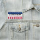 Name tag with white stars on blue background at the top and red and white stripes at the bottom. Template field for custom candidate name and one line of additional text. Fill in the name of your favourite political candidate.