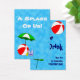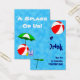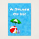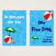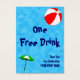 A custom business card sized event ticket template for free drinks, food or whatever you choose, with art of a pool umbrella and beach ball on watery blues.  Or customise it to change fonts, sizing and more, even save your design for later.