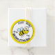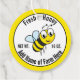 A cheerful bee is in the centre of this honey jar label. You can edit the text to create your custom message. The display text says 'Fresh Honey NET WT. 16 OZ. Add Name of Farm Here. The tag is round. The bee is inside a white circle that has a black and yellow border. The text is black.